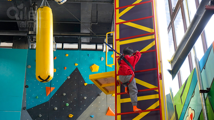 帶上護具,從梯子攀爬而上,到達頂點,縱身一躍,抱住拳擊袋,完成挑戰(zhàn)。