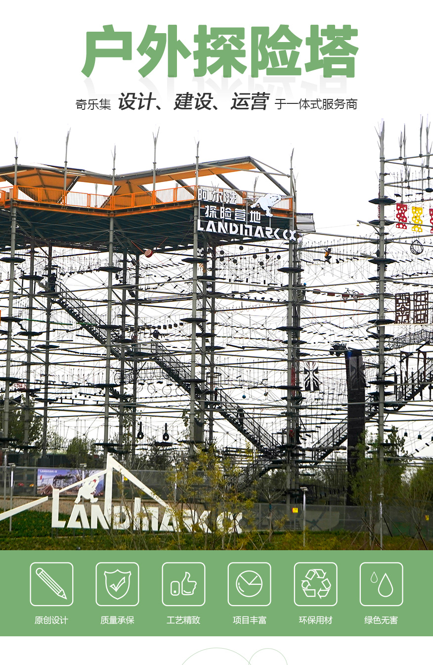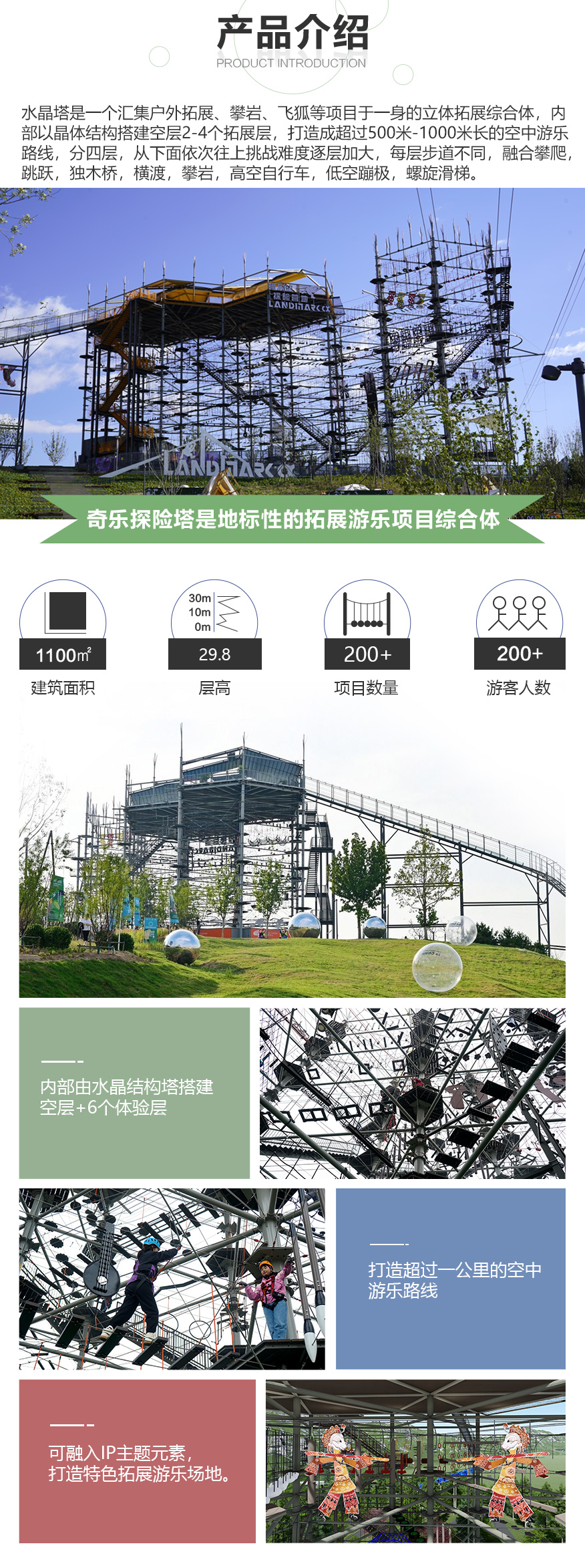 匯集 200 種游樂步道,適合廣大游客 水晶塔集冒險、運動、娛樂、挑戰(zhàn)于一體的綜合游樂類項目,通過在塔內設置并搭建各種難易不同、風格迴異、超強刺激的步道關卡,讓游客體驗高空墜落與自由滑翔的快感,感受塔內項目攀爬穿越的刺激。水晶塔是一個創(chuàng)新且極具盈利能力的全新休閑旅游項目,適合建在戶外,也可以建在窒內。 晶體結構,更穩(wěn)固,更安全 水晶塔采用品體結構設計,每4根立柱為1個晶體結構,可根據客戶需求自由組合,晶體結構設計更大的增加設備的穩(wěn)定性、利用率,保證客戶場地的實用率最大化,立柱之間做連桿支撐,根據結構設置觀景臺,可達 80~1000+m?,可作為餐飲,休閑吧,咖啡吧,酒吧等休閑休息區(qū)域,平臺下方懸空架連接桿支撐,平臺可同時承載 30-1000+人。 搭配我司自主研發(fā)生命系統(tǒng),保障安全無死角自主研發(fā)自鎖式雙掛鉤,相互交替型安全保障永遠保證有一個掛鉤自鎖在鋼絲繩上面,保障安全無死角。